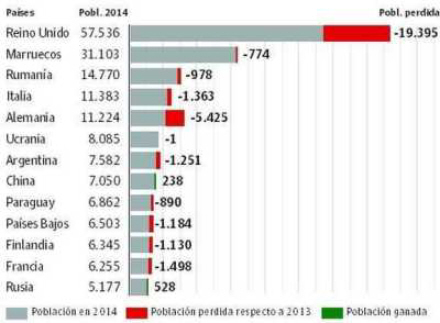 Kigger vi på nationalitet, boede der flest britiske udlændinge i regionen i starten af 2014 nemlig 57.536. Det er dog stadig et tab på 19.395 på et år. Marokkanerne kommer ind på en andenplads med 31.103 indbyggere og 774 fraflyttede. Rumænerne er på tredjepladsen med 14,770 indbyggere, og 978 er flyttet.