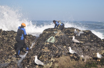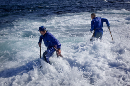 Hver gang en bølge trækker sig tilbage til havet, følger kvinderne hurtigt efter og bevæger sig erfarent til kanten af klippen, hvor hakker langhalsene fri med en metalstang.