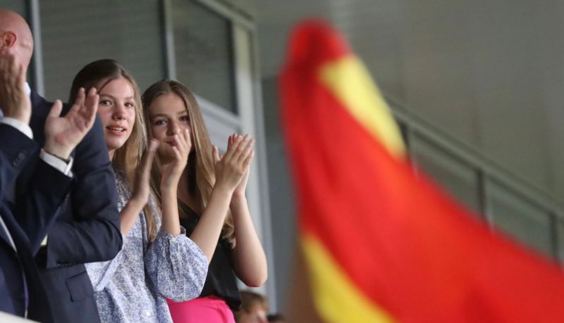 Kronprinsesse Leonor og hendes søster prinsesse Sofia overværede den sidste gruppekamp ved EM i England mellem Spanien og Danmark lørdag for at heppe på de spanske spillere.