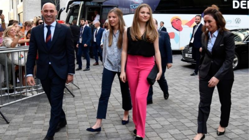 Præsidenten for Spaniens Fodboldforbud, Luis Rubiales, bød prinsesserne velkommen ved ankomsten til Brentford Community Stadium