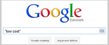 Søg på ”low cost” hvis du vil ud at flyve. Og husk de dobbelte citationstegn; på den måde undgår du søgeresultater, hvor de to ord ikke står i sammenhæng. Der er masser af her-og-nu slagtilbud, så hold øje med priserne hver eneste dag, og vær klar til at springe på flyet med kort varsel. Der er også mulighed for at få en rigtig go' deal med gruppe-rejser gennem kollektive køb. Prøv at se på Groupon eller Groupalia.