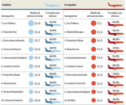 I Las Palmas var forsinkelserne for flystarter på gennemsnitlig 21 minutter, og over halvdelen af flyene - 51 procent - var forsinket.