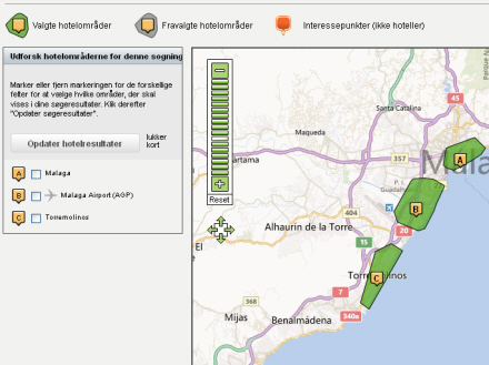 Hvis du eksempelvis søger på en overnatning i Málaga, kommer der en liste op med 14 hoteller. Her får du oplyst, hvor mange stjerner, hotellerne har, i hvilket område, pris og rabat. Blandt andet er der et femstjernet hotel i Torremolinos, hvor en overnatning fra den 1. til den 2. juli normalt koster 105 euro, men sælges nu til 65 euro.