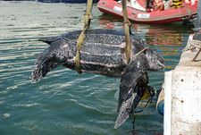 Den enorme skildpadde vejede 400 kg. og der måtte derfor en kran til, for at løfte dyret fri.