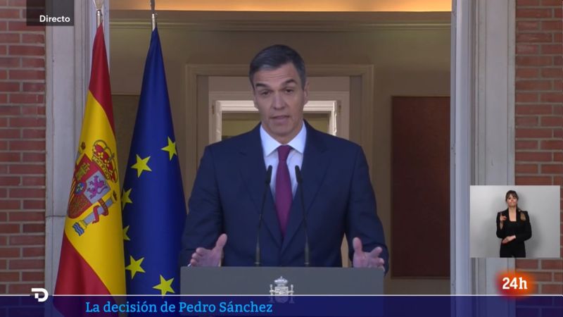 I sin institutionelle erklæring i Moncloa-paladset meddelte premierminister Pedro Sánchez, at han fortsætter i spidsen for regeringen efter at have reflekteret over sin kontinuitet midt i en bølge af solidaritet fra socialistiske ledere og militante i de seneste dage, som bad ham om at blive.