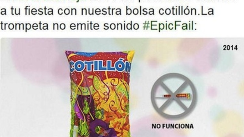 "Nytårsaften 2014 kan vi ikke slutte festen med vores party-poser. Trompeten siger ikke en lyd” skriver Mercadona sammen med et billede af en trompet, der er krydset ud med rødt for at understrege, at der ikke er lyd på.