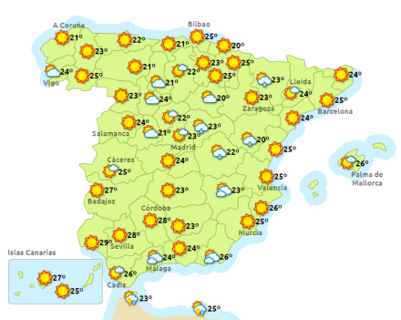 Dagtemperaturerne falder en smule i Galicien og Cantabrien, men ellers er der ikke megen forandring på den front.