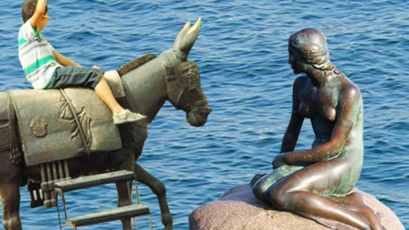 Skulpturen af den lille havfrue i København er noget ældre. Hun blev indviet i 1913 og er også udført i bronze, men hun er dog knap så let at komme til, som æsel-taxaen i Mijas Pueblo.