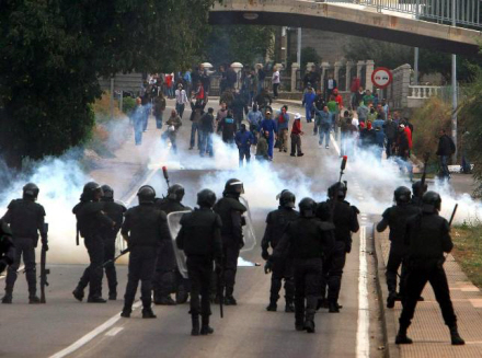 Fagforenings-kilder siger, at Guardia Civils indgriben medførte, at konflikten blev bragt ind midt i den lille landsby, hvor både betjente og demonstranter begyndte at kyle objekter i hovedet på hinanden.