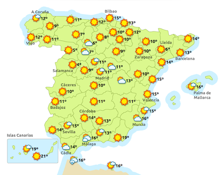 Madrid nærmer sig julen med ganske flot og stabilt vejr. I dag står den på en delvist skyet himmel, men med masser af muligheder for solskinsvejr. Sådan bliver det hele dagen, mens temperatuererne holder sig på mellem 5 og 12 grader.