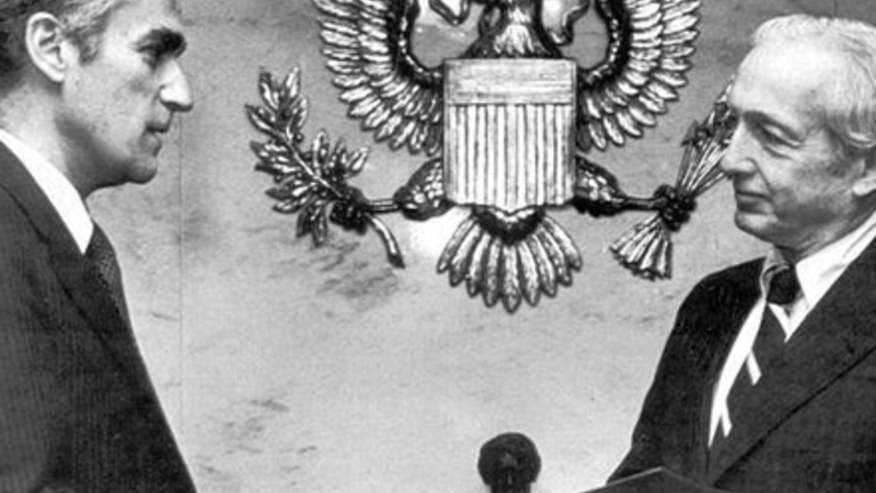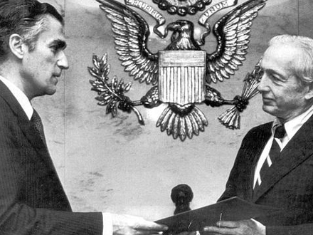 På billedet ses Alonso Álvarez de Toledo overrække optagelsespapirerne til Walter Stoessel, daværende nummer to under Alexander Haig, som var Ronald Reagans daværende udenrigsminister.
