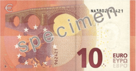 Mens købekraften på den nye 10-euro er uændret, så er det visuelle design ændret, og trykteknikken skal gøre det endnu sværere for falsknere.