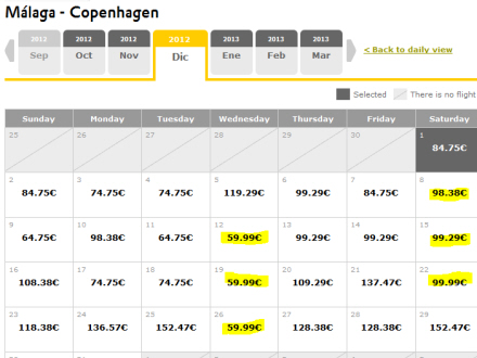 Eksempel på priser fra Málaga til København i december