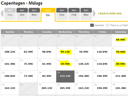 Eksempel på priser fra København til Málaga i december