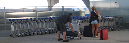 Et par glæder sig over at finde en bagagevogn ved stationens udgang. De ved dog ikke, at de snart enten skal stå i kø ved en elevator eller lade bagagevognen stå og på ny mosle kufferterne op ad endnu en rulletrappe.