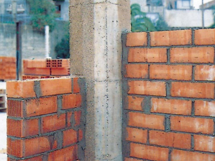 Her ses de murede vægge i et byggeri. Bemærk hvordan de kun er ”bundet sammen” med betonpillen af mørtel.