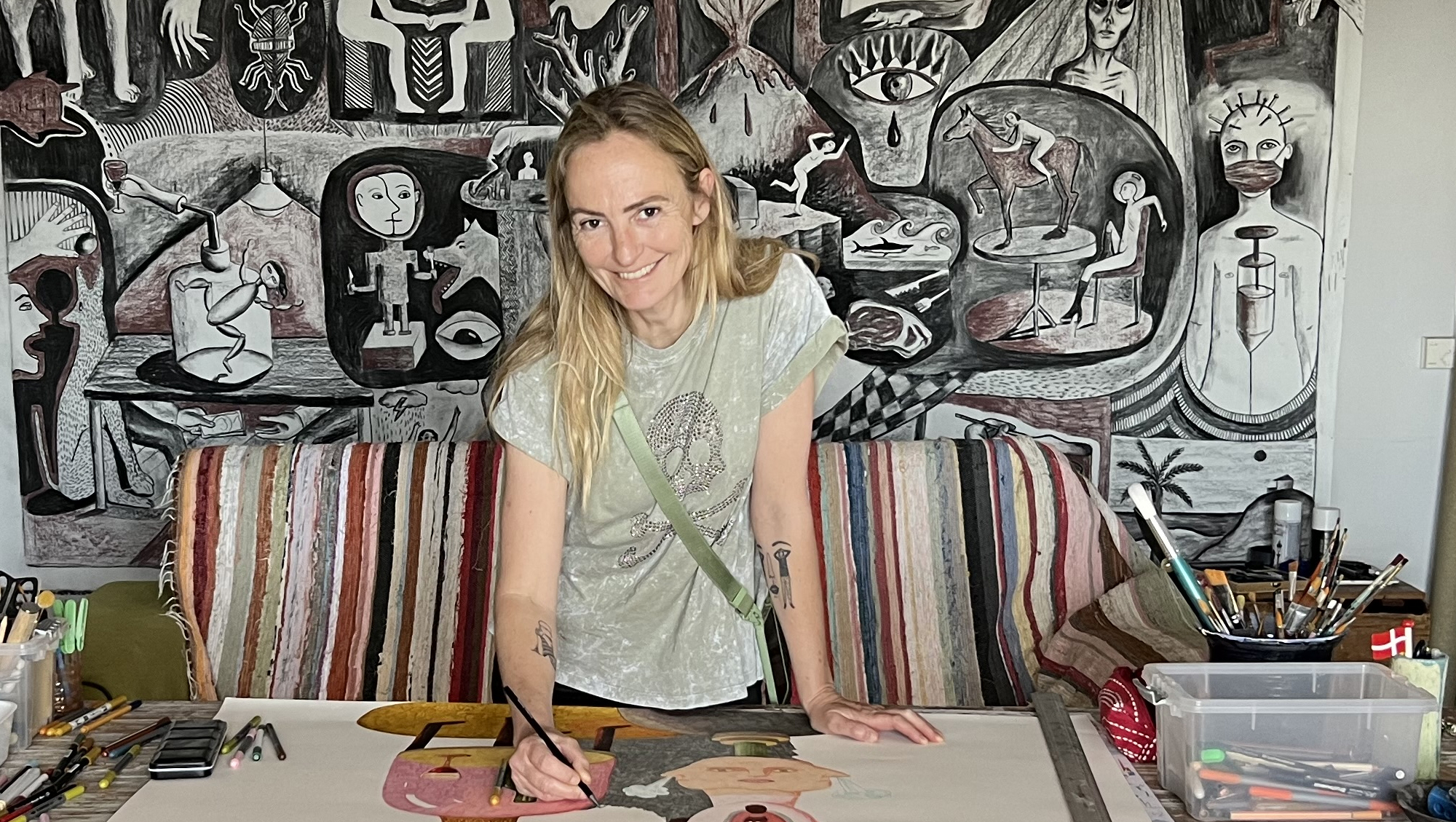 - Jeg udstiller skulpturer lavet af glaseret ler eller stentøj, og tegningerne er tegnet med kul, tusch, kuglepen, farveblyant, akvarel og jod på papir af stor format, siger Caroline til Spanien i dag.