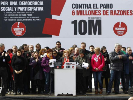 Under sloganet ”mod arbejdsløshed - seks millioner grunde” deltog mere end 150 organisationer herunder fagforeninger i ”det sociale topmøde”, der samlede i alt op mod 300.000 mennesker i gaderne i Catalonien, Madrid, Valencia og Asturien.