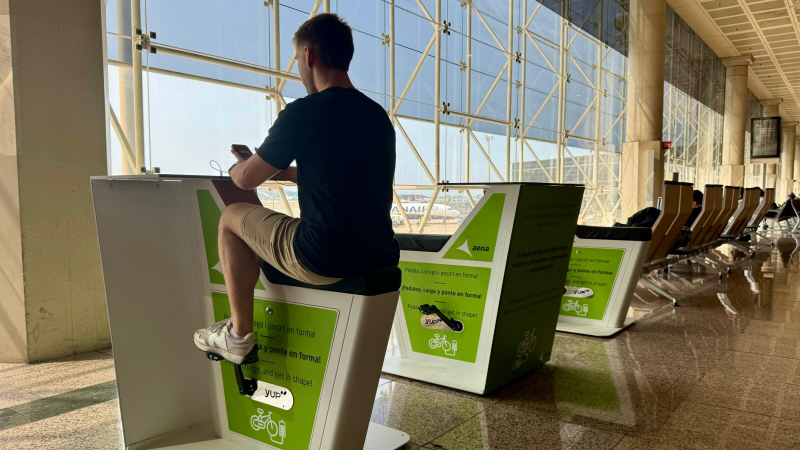I Terminal T2 kan rejsende nu oplade deres mobiltelefoner, tablets eller andre elektroniske enheder ved hjælp af motionscykler, der omdanner kinetisk energi til elektricitet.