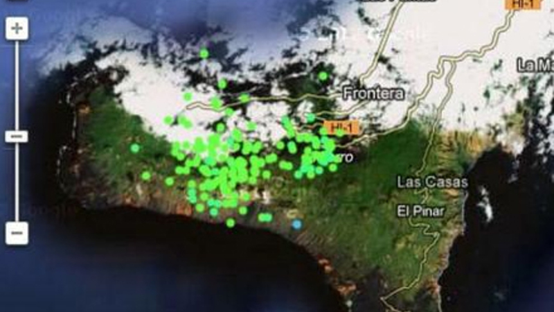 En animation over gårsdagens mange skælv lavet af Avcan viser, at jordskælvene bevægede sig i retning af den undersøiske vulkan, der var i udbrud indtil i foråret, der ligger lige syd for El Hierro.