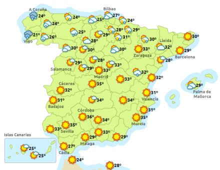 Madrid, mest sol, 20 - 36 grader, Barcelona, en del sol, 22 - 29, Valencia, sol og 23 – 33, og Málaga, sol, 24 – 32 grader.