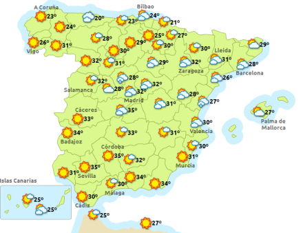Madrid har i dag solrigt vejr med 19 til 35 grader, Barcelona, letskyet og 21 til 26 grader, Valencia ligeledes letskyet og 20 til 29 grader, Málaga får i dag ret solrigt vejr med svag vind og mellem 22 og 28 grader.