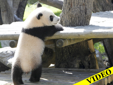 Ledsaget af sin mor kravlede den 15 kilo tunge panda-bayen over på et særlig klatrestativ og sprang ud i forårssolen – til stor begejstring for tilskuerne.