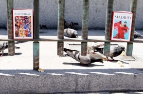 Og der gik ikke mange sekunder, før duen Pedro landede lidt genert mellem de to bøger. Den skulede lidt hen mod 'Turen går til Amsterdam', men i løbet af blot få nanosekunder havde den taget en beslutning og hoppede hurtigt og målbevidst over mod 'Turen går til Madrid', hvor den uden tøven gumlede løs.