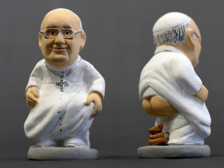 Pave Francis er tilsyneladende populær i Catalonien. Så populær, at man i år kan give ham rollen som ”caganer” i sit krybbespil. Et ægte catalansk krybbespil indeholder nemlig altid en bukseløs figur i fuld gang med at lave ”Nummer 2”.