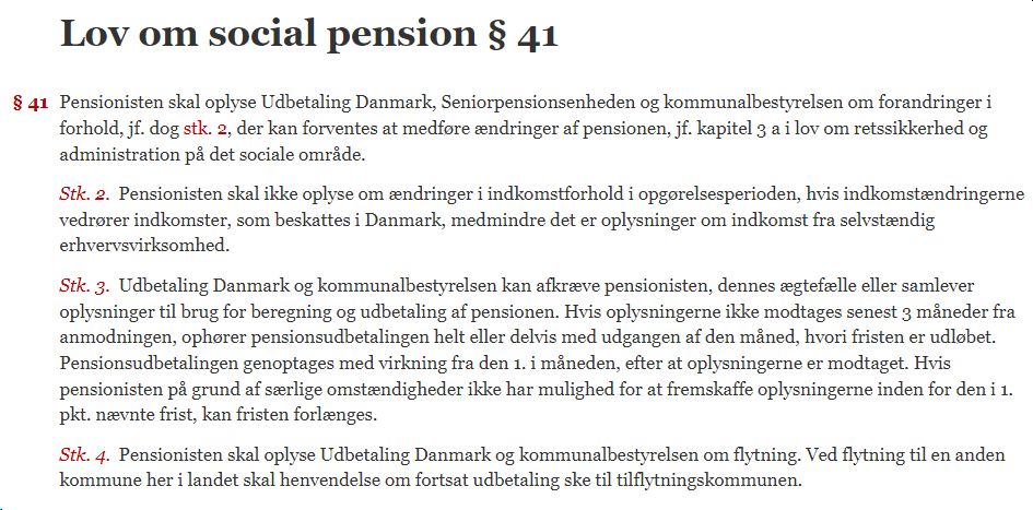 Det fremgår af lov om social pension § 41, stk. 3, at Udbetaling Danmark kan afkræve pensionisten eller dennes ægtefælle eller samlever oplysninger til brug for beregningen og udbetaling af pensionen. Det er således denne bestemmelse, der regulerer retsvirkningen af, at pensionisten ikke besvarer Udbetaling Danmarks anmodning om at fremsende oplysninger herunder leveattest, der er relevante for berettigelse til og beregning af pension. Hvis oplysningerne ikke modtages senest 3 måneder fra anmodningen, ophører pensionsudbetalingen helt eller delvis med udgangen af den måned, hvori fristen er udløbet. Pensionsudbetalingen genoptages med virkning fra den 1. i måneden, efter at oplysningerne er modtaget. Hvis pensionisten på grund af særlige omstændigheder ikke har mulighed for at fremskaffe oplysningerne inden for fristen på de 3 måneder, kan fristen forlænges.