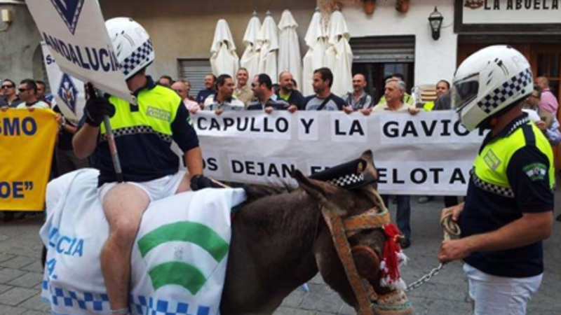 Betjentene kom ridende på æsler i demonstrationen, som blev afholdt uden for rådhuset i Alcalá de Guadaira. Betjentene siger, at de ikke kan arbejde uden ressourcer og kræver brændstof og radioer til alle.