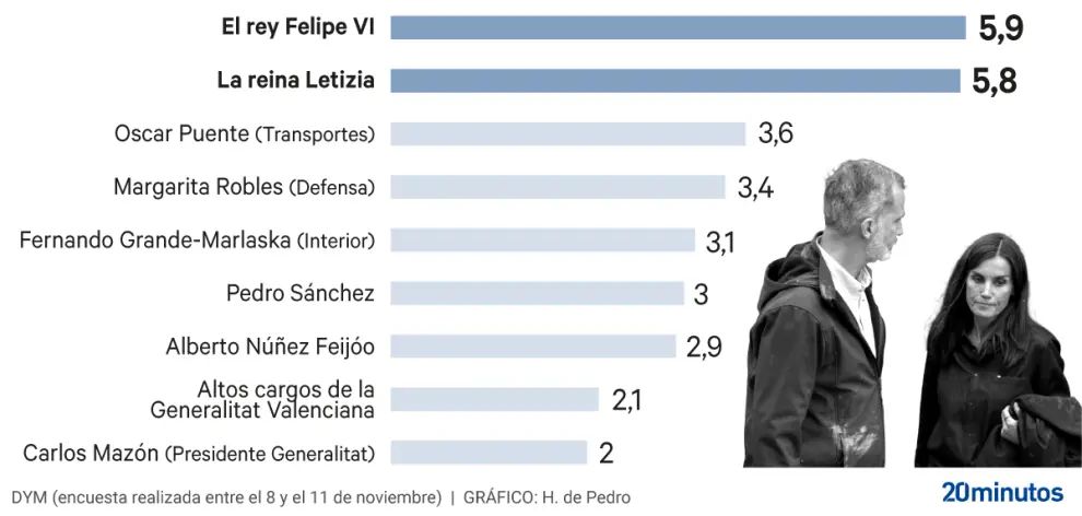 Af alle de personligheder, der er knyttet til DANA, er kong Felipe VI og dronning Letizia faktisk de eneste, der har fået en positiv vurdering fra offentligheden - henholdsvis 5,9 og 5,8 - efter deres komplicerede besøg i byen Paiporta. De blev ledsaget af regeringspræsident Pedro Sánchez og præsidenten for Generalitat Valenciana Carlos Mazón, som begge fejlede i deres håndtering af krisen.