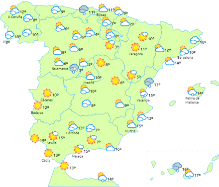 Temperaturerne falder, hvilket vil være særligt mærkbart i maksimumniveauet i de indre egne. Det betyder 15 til 17 grader, mens man i Antequera og Ronda ikke kommer over ni grader, og i nat bliver det mellem fem og seks grader, mens man kan få frost i Antequera og Ronda, når vi ryger ned på mellem minus én grad og tre plusgrader.