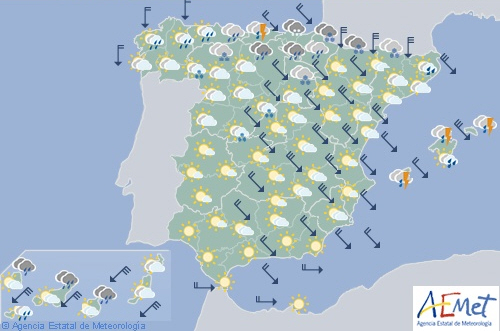 I den nordlige tredjedel af halvøen og på De Baleariske Øer er det uklart eller overskyet med nedbør, som lokalt kan være vedvarende eller opnå en vis intensitet i Biscayabugten, det nordlige Navarra, områder i Pyrenæerne, kysten i Catalonien og på Balearerne. Af og til torden og hagl også.
