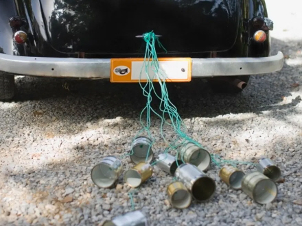 Biltyven fastgør ganske enkelt et par tomme sodavand til en snor, der så siddet fast bag på bilen.