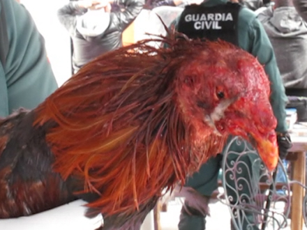KRIMI: 25 mennesker så jublende til, mens to stakkels haner rev hinanden til blods. Det foregik i Alicante, og politiet fandt adskillige sårede haner, våben og penge, da de stormede stedet.