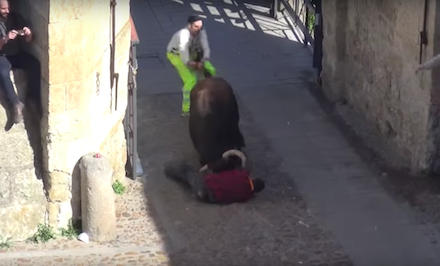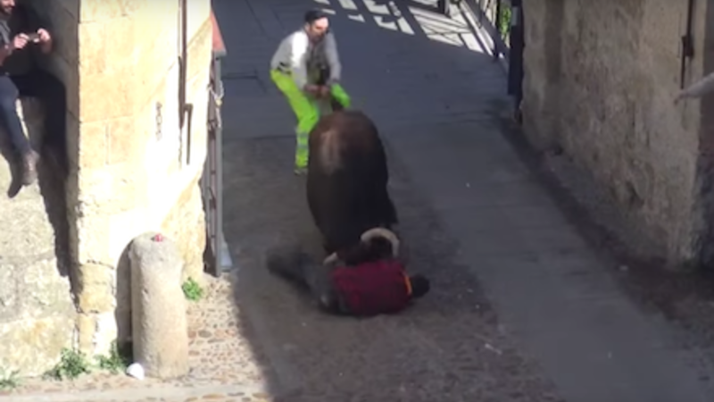 I går endte den stærkt omdiskuterede tradition endnu en gang i drama, da en af løberne ved det traditionsrige tyreløb i Salamanca i Castilla y León blev slået omkuld og derefter kastet rundt på en brolagt gade.