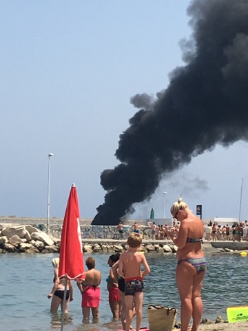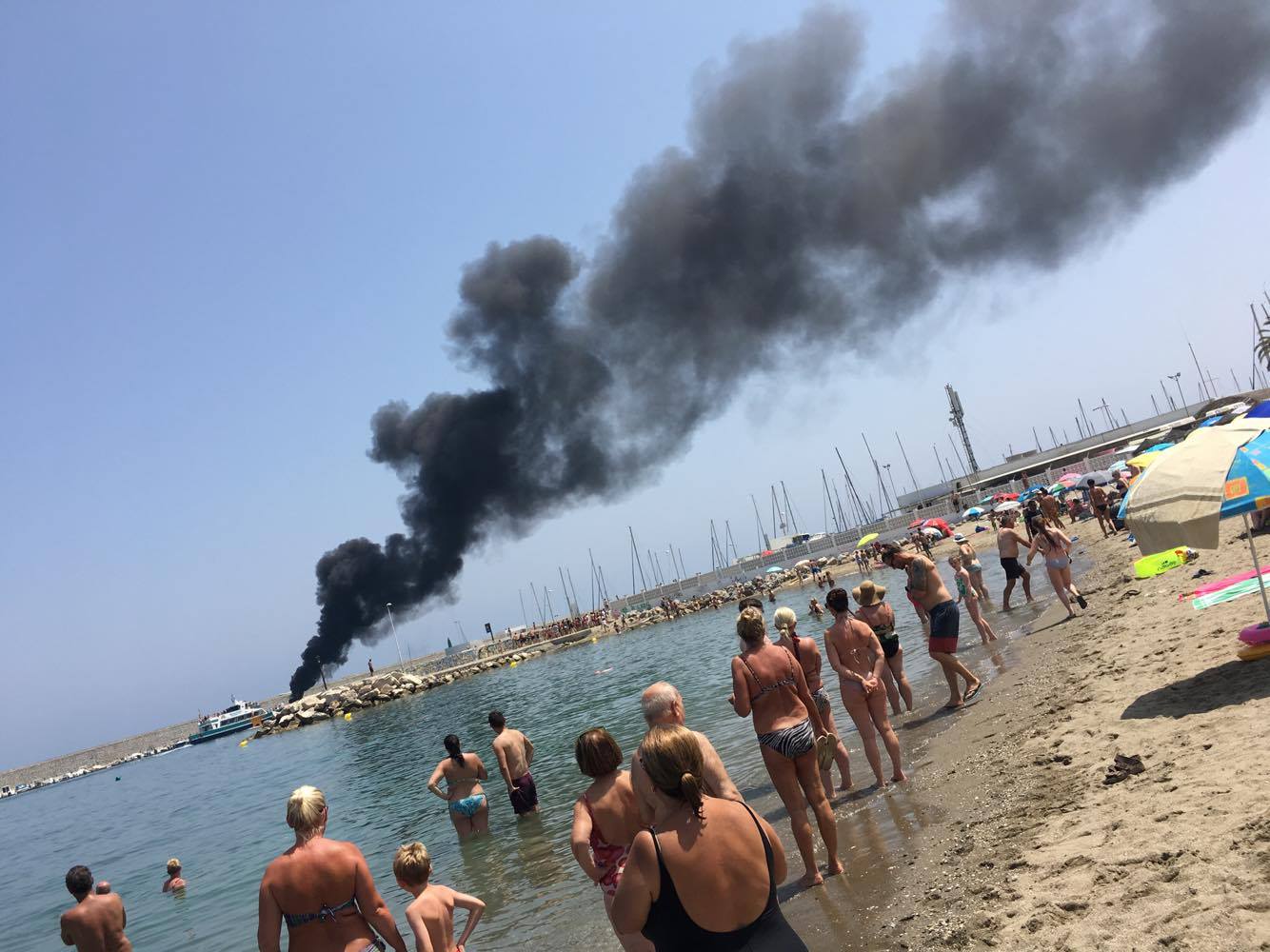 VIDEO: Netop nu er brandfolk i gang med at slukke en voldsom bådbrand i Fuengirola Havn foran tusindvis af strandgæster.
