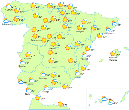 Der kommer også perioder med overskyet himmel i begyndelsen af dagen i andre områder af halvøens nordlige områder og i Levante-området, der har tendens til at være letskyet hele dagen.