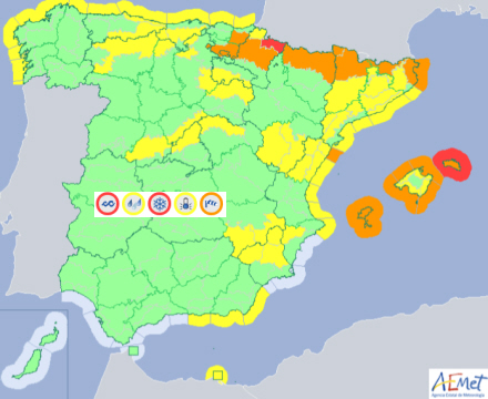 Der advares om meget kraftige vindstød i Pyrenæerne, Ampurdán, højtliggende egne i Centralspanien, den østlige tredjedel samt på Balearerne, mens den står på meget lave temperaturer i Pyrenæerne.