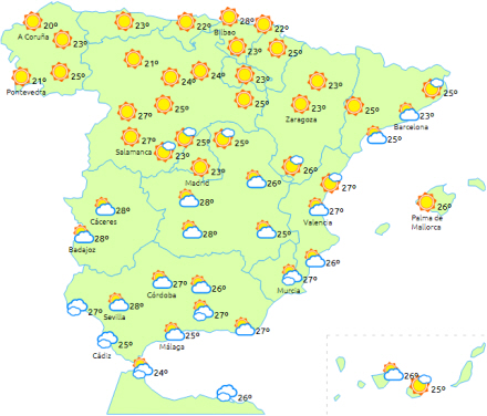 Perioder med overskyet himmel og morgentåger. Temperaturer med få ændringer bortset fra stigninger i maksimumniveauerne i nord. Det betyder 26 til 27 grader og 15 til 20 i nat.