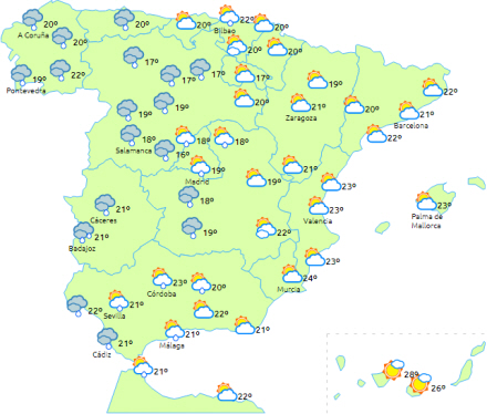 Skyet himmel med morgentåge og tilbøjelighed til overskyet himmel i slutningen af dagen. Minimumstemperaturer med få ændringer og maksimum- i fald i de indre egne, og dermed havner vi på 20 til 23 grader og 11 til 14 i nat.