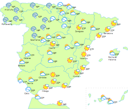 Faldende dagstemperaturer i halvøens nordvestlige hjørne og ingen større ændringer eller let stigende på resten af halvøen og Balearerne. Ingen voldsomme ændringer på De Kanariske Øer.