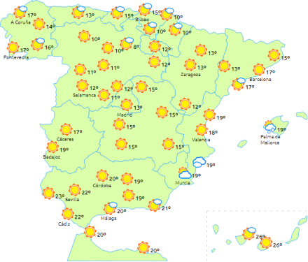 Letskyet himmel til det meste af landet. Der vil dog være nogle lavthængende morgenskyer i områder af nordvestkysten og den øvre Ebro-dal og måske noget let regn i Guipúzcoa.