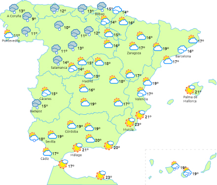 Stigende temperaturer i dagtimerne på halvøens indre og sydlige egne, mens de er faldende ved Middelhavskysten, i Ebro-dalen, den nordvestlige tredjedel af halvøen og på De Kanariske Øer. Nattemperaturerne sker der ikke meget med.