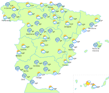 Stigende dagstemperaturer i det meste af landet. Nattemperaturerne stiger også, men især i det indre af halvøens nordvestlige egne. Svag og spredt frost i bjergområder i den nordlige og sydøstlige halvdel - mest udbredt og intens i Pyrenæerne.