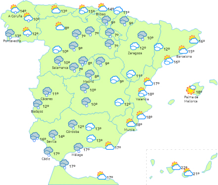 Lokalt vedvarende regn i dagens anden halvdel i Galicien, mens der varsles kraftig vind samme regions kyster og kraftige vindstød i de cantabriske bjerge.