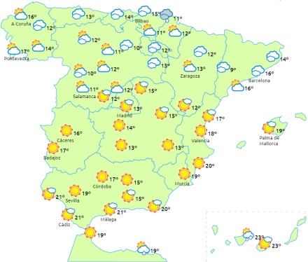 Tiltagende uklarhed i de nordlige dele af halvøen og på De Baleariske Øer med nedbør i dagens anden halvdel til nordvestkysten, det nordlige Navarra, Pyrenæerne og Menorca uden helt at kunne udelukke Ebro-dalen, Girona og resten af De Baleariske Øer.