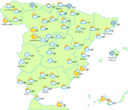 Faldende dagstemperaturer undtagen i Middelhavsområdet og på De Kanariske Øer, hvor de holder niveauerne. Nattemperaturerne falder på den nordvestlige tredjedel af halvøen, hvilket kan være ret bemærkelsesværdigt i Galicien, Asturien og León.