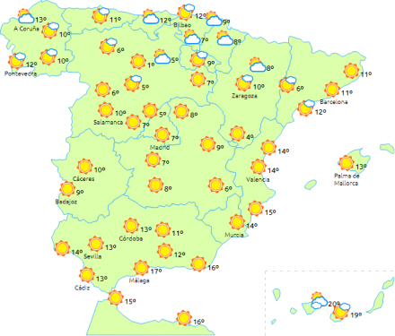 Højtryk giver stabilt vejr i store dele af landet med letskyet eller klar himmel. Ved nordvestkysten, i Ebro-dalen og Navarra dog fortsat gråvejr med regn - sikert også til de nærliggende områder, men det har generelt tendens til at aftage i løbet af dagen.